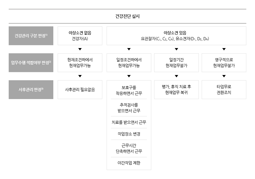 업무수행 적합 여부 평가를 통하여 건강진단결과에 대한 사후관리를 한다.